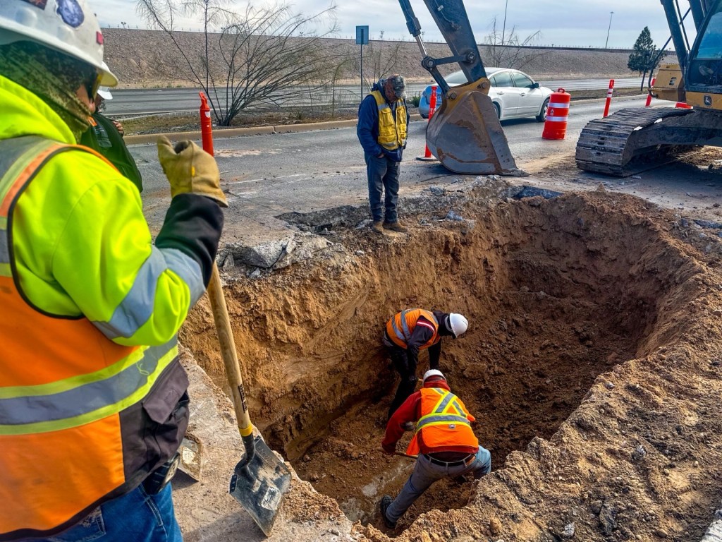 La Junta de Agua y Saneamiento de Juárez trabaja en la reparación de un hundimiento sobre la avenida Cuatro Siglos. El desperfecto ocurrió este lunes.