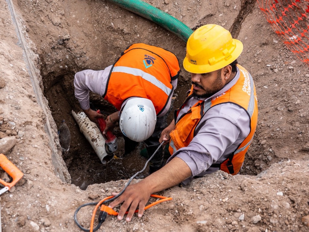 Personal de la red de agua instala una válvula en el cruce de las avenidas Hermanos Escobar y López Mateos. La obra busca mejorar el control.