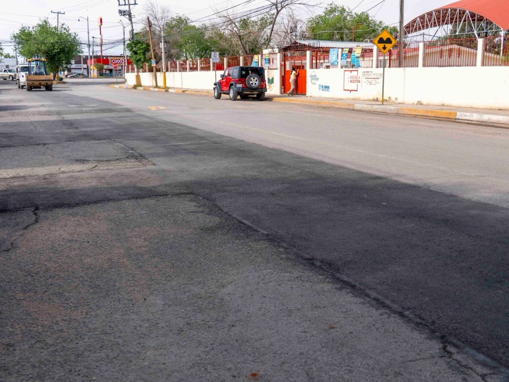El personal realizó limpieza y colocó pavimento nuevo frente a la escuela primaria. La calle Neptuno permite el paso de vehículos sin generar tráfico este lunes.