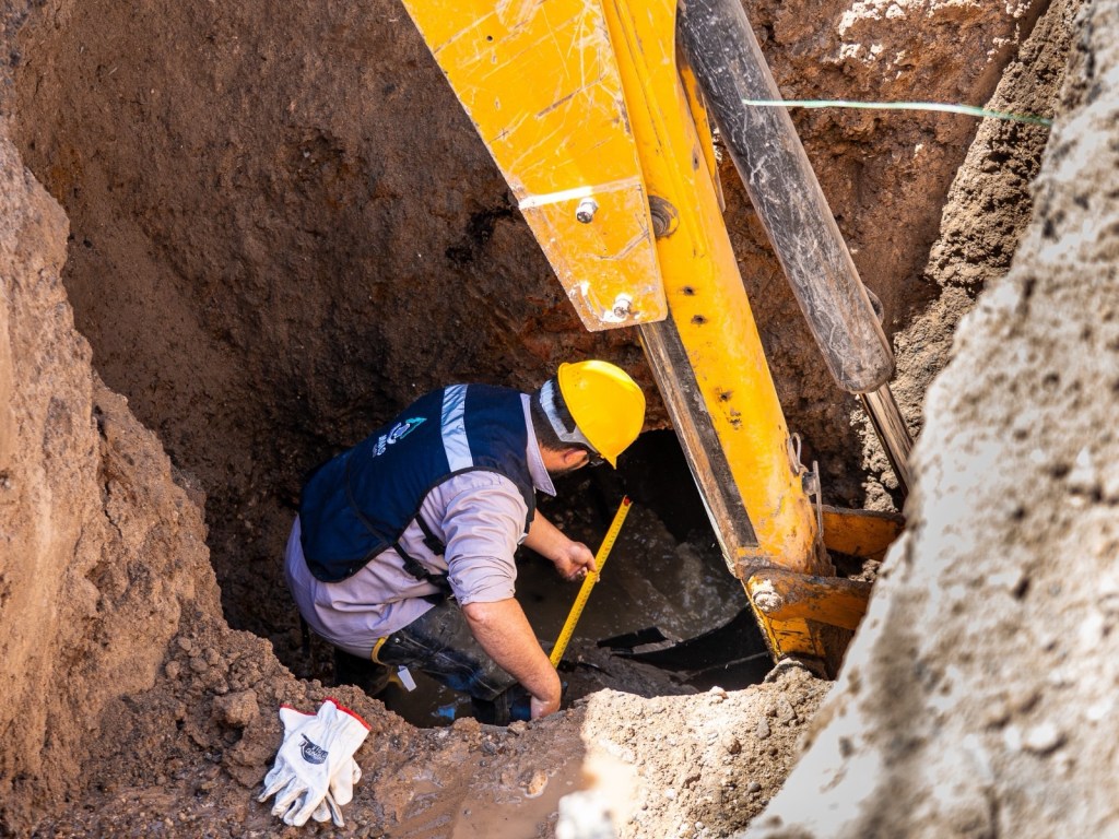 Cuadrillas de la junta de agua trabajan en la calle Anáhuac. El equipo repara un colector de treinta pulgadas por un hundimiento en el pavimento vial.